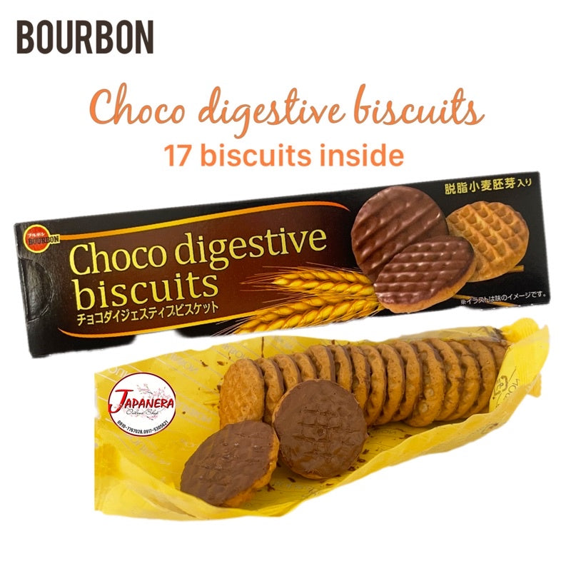 Choco Digestive Chocolate Digestive Biscuits from Japan by Bourbon are perfectly round and crunchy Japanese cookies that are half-coated with delicious, rich milk chocolate. These biscuits are made using whole wheat flour and natural flavors.